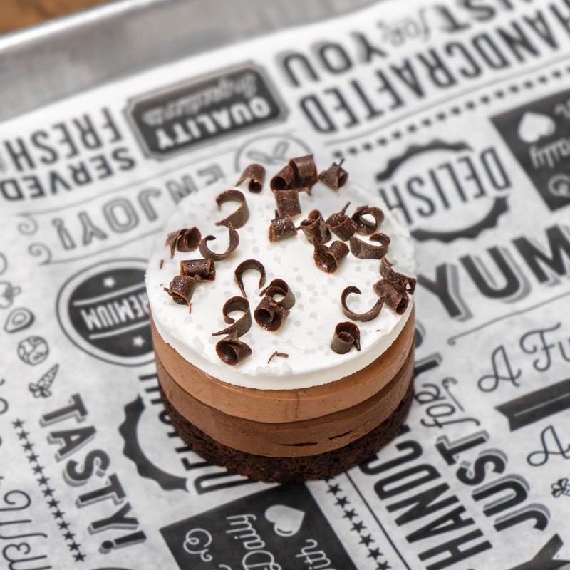Chocolate genoise (cake) topped with dark chocolate, milk chocolate, and white chocolate mousse.