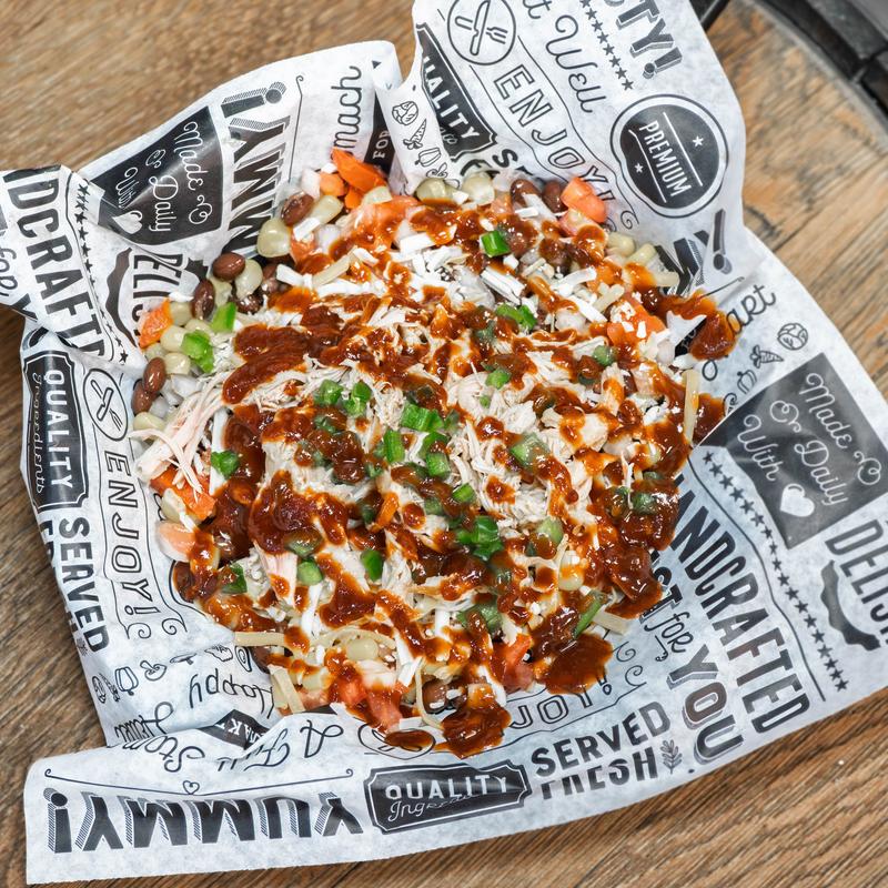 Smokey pulled chicken over a hearty mix of sweet corn, black beans, tomato, jalapeños, and onion, all topped with shredded cheese and a drizzle of BBQ sauce.