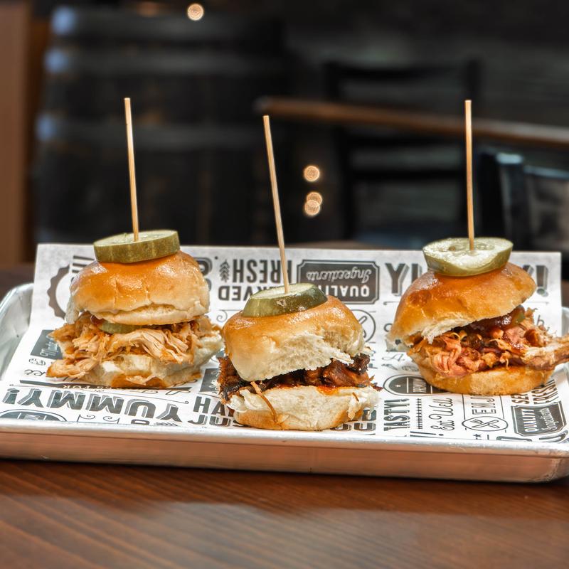 A trio of pulled pork, brisket, and pulled chicken sliders, topped with house pickles and a smoky BBQ sauce.