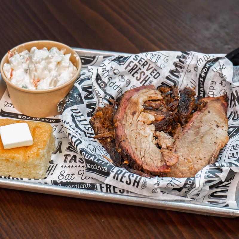 Smoked brisket served with cornbread and your choice of side.
