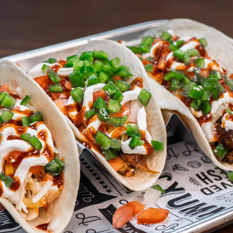 One track, three engines: smoked brisket, pulled chicken, and pulled pork - each taco stacked with tomato, onion, shredded cheese, jalapeño, sour cream, and BBQ sauce.