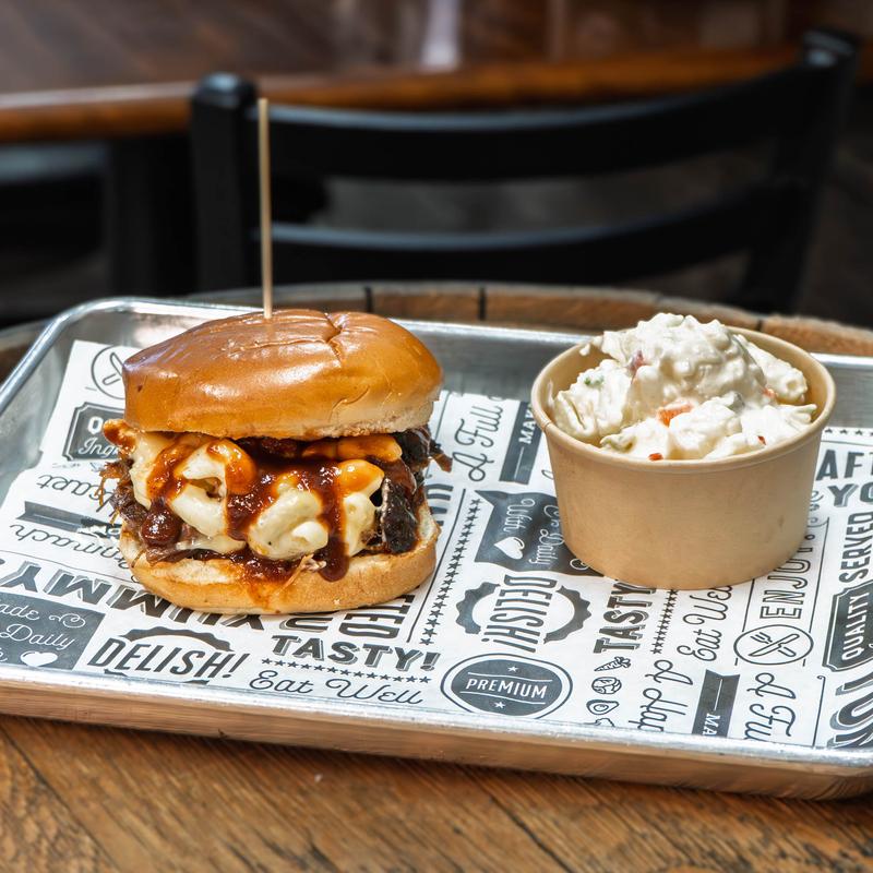 Smoked brisket, mac & cheese, BBQ sauce, and shredded cheese on a soft brioche roll. Served with your choice of side.