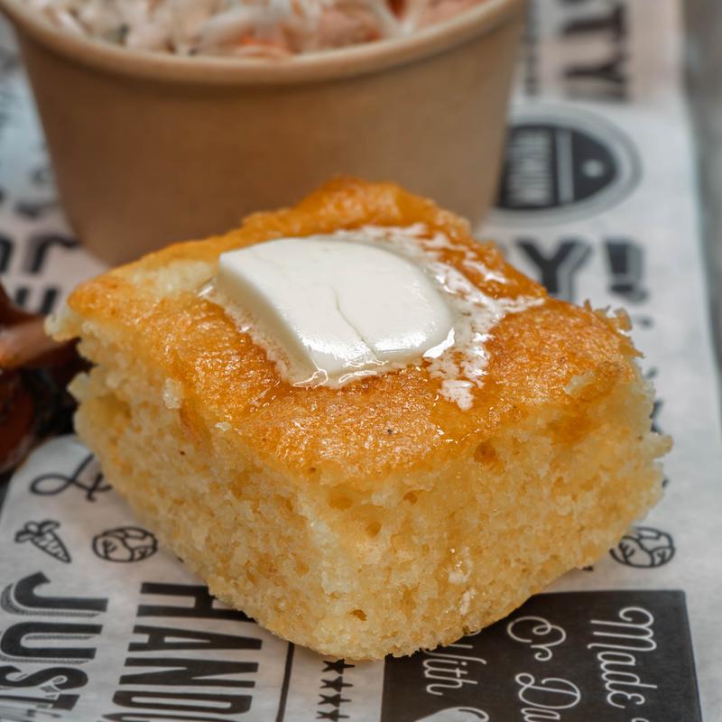 Juicy pork ribs with a BBQ kick - full rack served up with soft cornbread and your choice of a side.